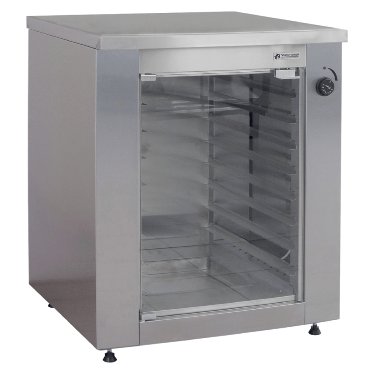 8 уровней с шагом 70 мм. Гастроемкость GN 2/1. Механическая панель управления. Максимальный нагрев: 90°C. Мощность: 1500 Вт. Напряжение: 220 В. Габариты 795х955х870 мм.