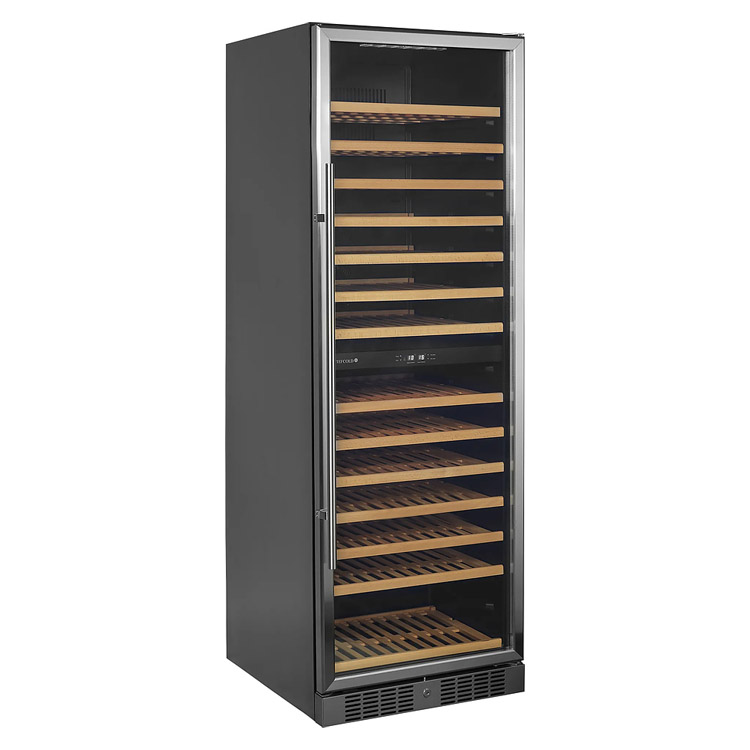 Корпус винного холодильного шкафа чёрного цвета, внутренняя отделка из ABS-пластика чёрного цвета. Шкаф оснащён стеклянной дверцей с рамой и ручкой из нержавеющей стали. Благодаря дверце из прозрачного стекла, чёрной внутренней поверхности и светодиодному освещению шкаф выглядит свежо и современно. Выдвижные деревянные полки не только красивы, но и удобны в использовании.