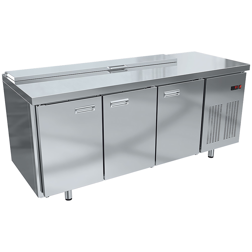 Холодильный стол KRONER СХС 3-180-70 — это современное оборудование, специально разработанное для предприятий общественного питания и торговли. Модель идеально подходит для обработки и сохранения свежести ингредиентов, используемых при приготовлении холодных закусок, салатов и других блюд. Благодаря продуманной конструкции, высокому уровню надежности и инновационным технологиям, этот стол обеспечивает оптимальные условия для хранения продуктов и удобство их обработки на рабочей поверхности. Холодильный агрегат с боковым расположением делает камеру хранения более доступной, а интегрированный в столешницу салат-бар с откидной крышкой позволяет держать все необходимые ингредиенты под рукой. Корпус и столешница выполнены из шлифованной нержавеющей стали, что гарантирует долговечность и устойчивость к механическим повреждениям, а задняя стенка из оцинкованной стали обеспечивает дополнительную защиту от воздействия влаги.