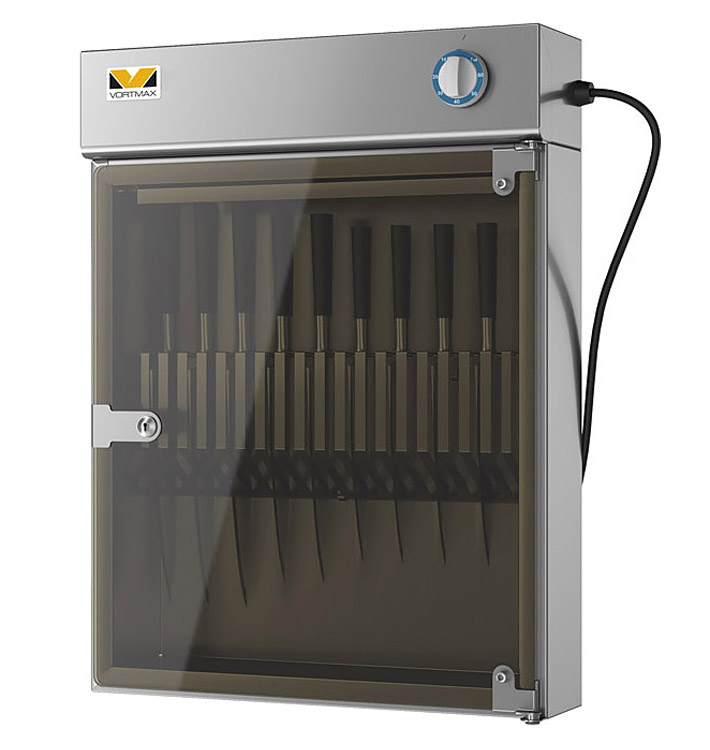 Стерилизатор для ножей Vortmax KS 18 дезинфицирует столовые приборы на предприятиях торговли и общественного питания. Процесс дезинфекции происходит за счет использования в приборе ультрафиолетовой лампы, благодаря этому убиваются все микробы и бактерии, а структура материала ножей остается целой.